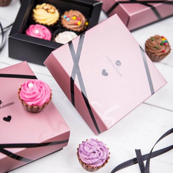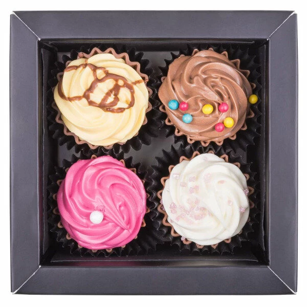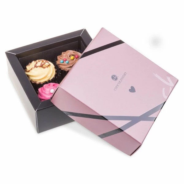 Schon beim Anblick dieser süßen Leckerei schmilzt Ihre Liebste oder Ihr Liebster dahin! In der roséfarbenen Schachtel mit schwarzen Verzierungen verbergen sich vier herrlich süße Pralinen, die wie kleine Cupcakes aussehen.