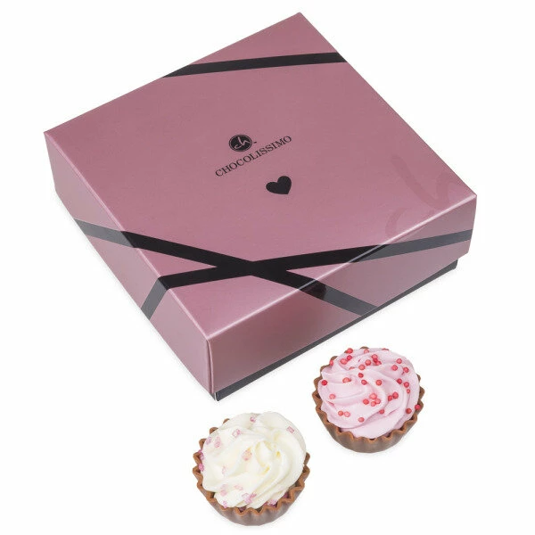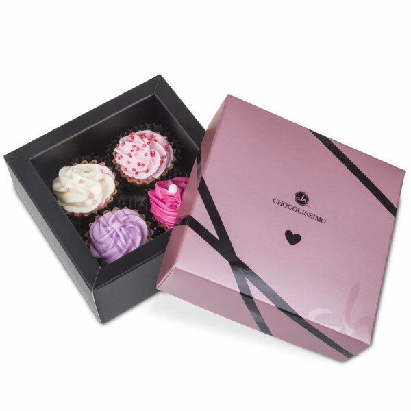 Schon beim Anblick dieser süßen Leckerei schmilzt Ihre Liebste oder Ihr Liebster dahin! In der roséfarbenen Schachtel mit schwarzen Verzierungen verbergen sich vier herrlich süße Pralinen, die wie kleine Cupcakes aussehen.