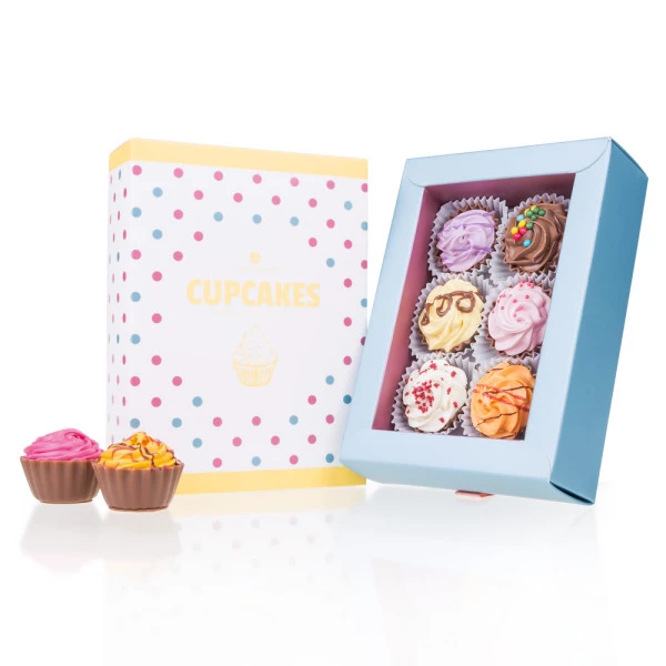 Verzaubern Sie Ihre Liebsten mit dieser süßen Versuchung! In einer gepunkteten Schachtel, die ganz in Pastellfarben gehalten ist, verbergen sich sechs Pralinen in Form von Cupcakes.