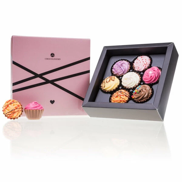 Die eingelegten Pralinen sind eine Zufallsauswahl aus unserer Cupcake-Pralinen-Kollektion. Daher kann es zu Abweichungen zu den Produktbildern und zu Dopplungen der eingelegten Pralinen kommen.