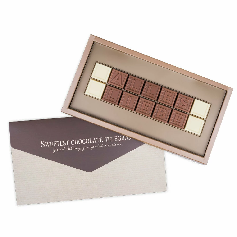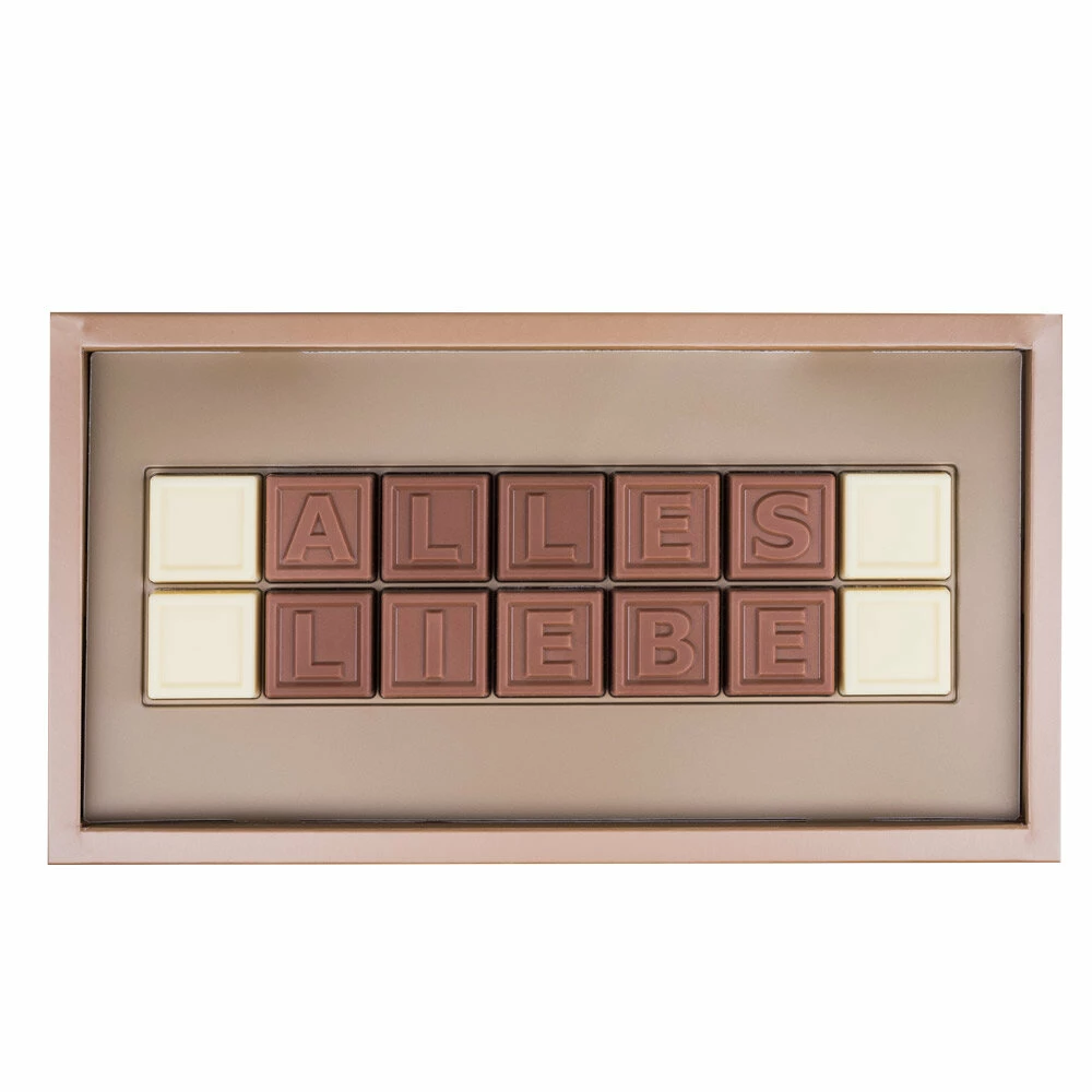 Die schöne Schokoladennachricht besteht aus 4 Stücken aus weißer Schokolade und 10Stückchen aus Vollmilchschokolade.Perfekt als ein Glückwunsch zum Geburtstag, Muttertag, Vatertag oder Frauentag.