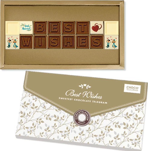 Verschenken Sie ein außergewöhnliches Geschenk an das frisch vermählte Paar an ihrem besonderen Tag! Das ChocoTelegram „Best Wishers“ besteht aus insgesamt 16 köstlichen Schokoladenstücken, liebevoll verpackt in einem eleganten Umschlag.