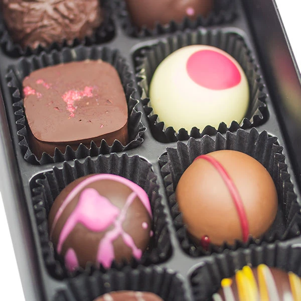 Die Pralinen bestehen größtenteils aus Zartbitterschokolade, aber auch einige aus Vollmilch- und weißer Schokolade sind dabei!