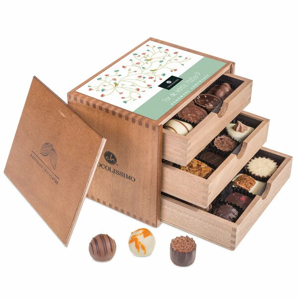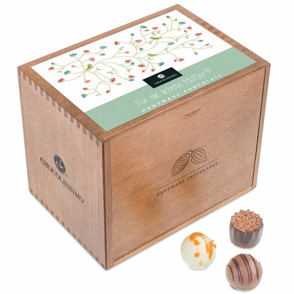 Diese besteht aus 30 edlen Pralinen. Diese werden auf die drei Schubladen eines edlen Holzkästchens verteilt, welches auf der Oberseite mit einem Sticker mit floralem Muster und Muttertagsgruß versehen ist.