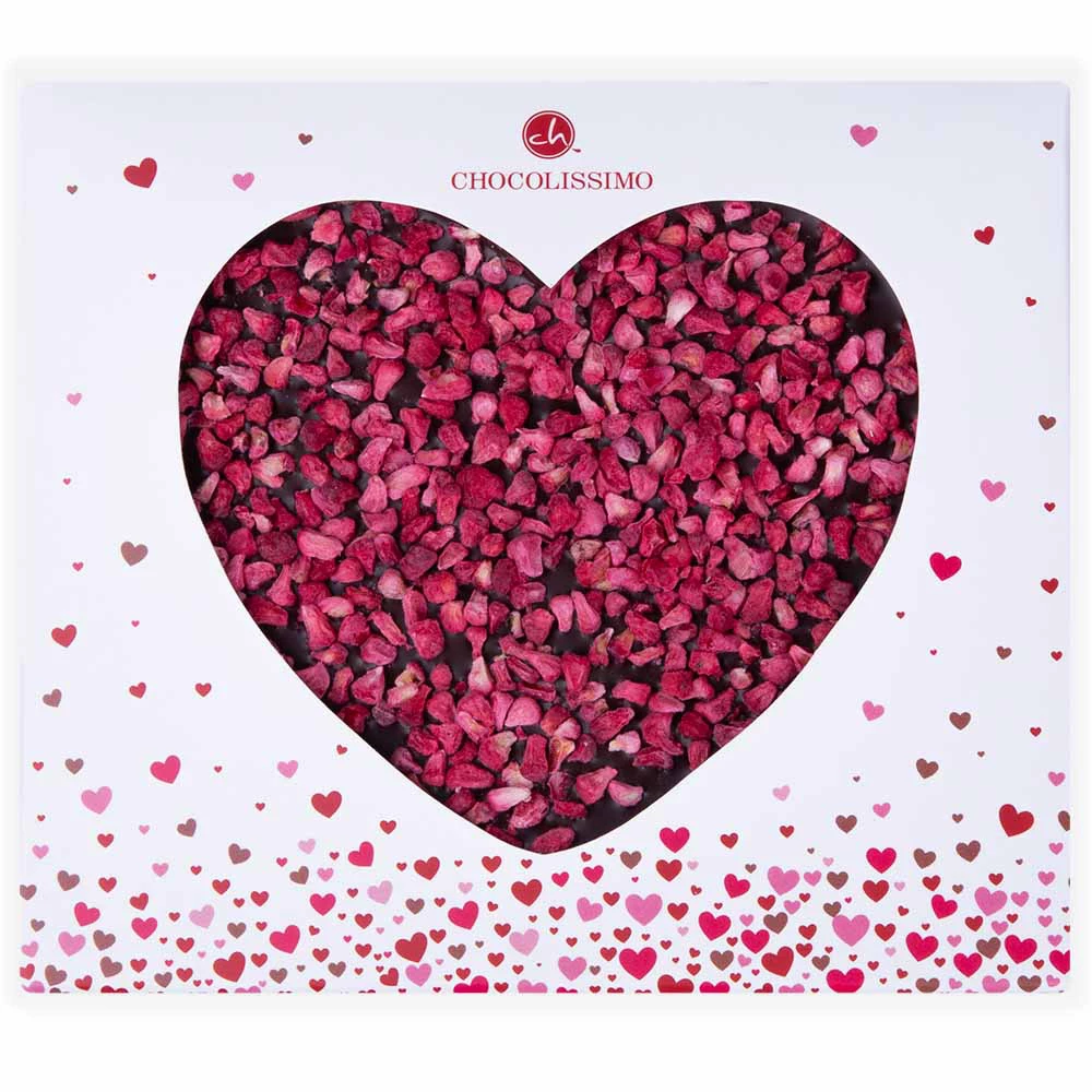 Lassen Sie Ihre Liebsten diese herrliche Zartbitterschokolade genießen, die mit gefriergetrockneten Himbeeren bestreut und in einer romantischen Schachtel in Weiß und Pink verpackt ist.