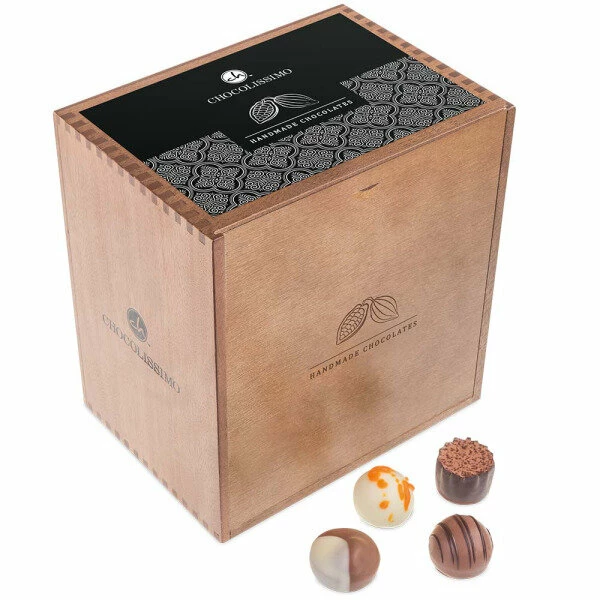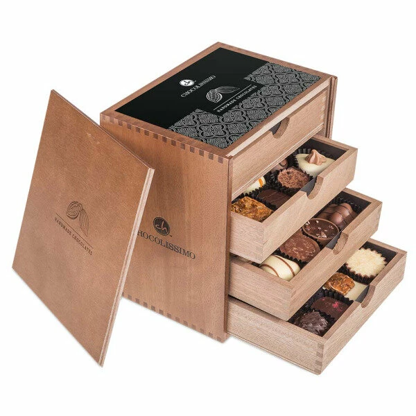 Ein XXL-Geschenk mit XXL-Pralinenmenge – da kann man nicht nein sagen! ‚ChocoMassimo‘ ist ein gelungenes Geschenk zum Firmenjubiläum oder zum runden Geburtstag. Dieses exklusive Holzschatzkästchen mit vier Schubladen beinhaltet eine erlesene Auswahl von vierzig handgerfertigten Pralinen, mit und ohne Alkohol. Das Holzkästchen kann per Lasergravur mit einem von Ihnen gewählten Text versehen werden. Die Gravur wird auf dem Schiebedeckel anstatt der Abbildung der Kakaobohnen angebracht. Sollten Sie keine Gravur wählen, so wird auf dem Kästchen standardmäßig eine Abbildung von Kakaobohnen eingraviert.