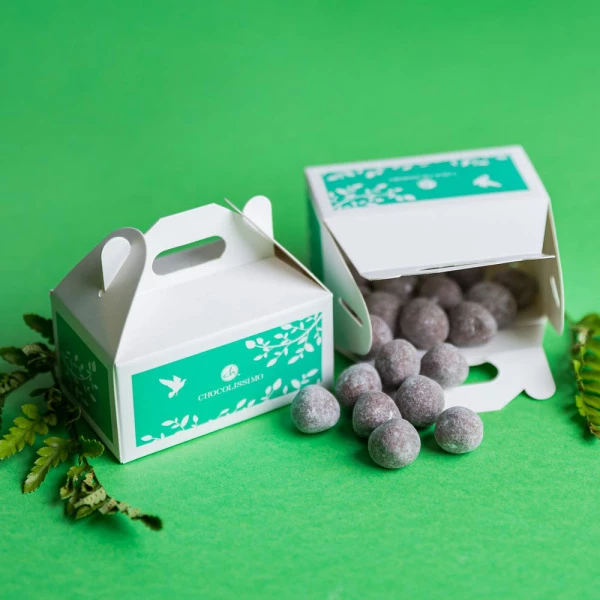 In dem frühlingshaft dekorierten Schächtelchen verbergen sich knackige, karamellisierte Nüsse in einem Mantel aus Vollmilchschokolade mit Puderzucker bestäubt.