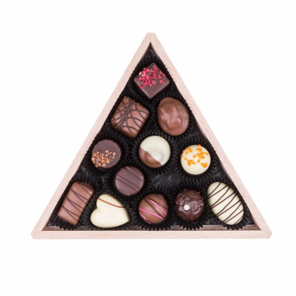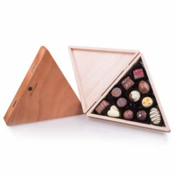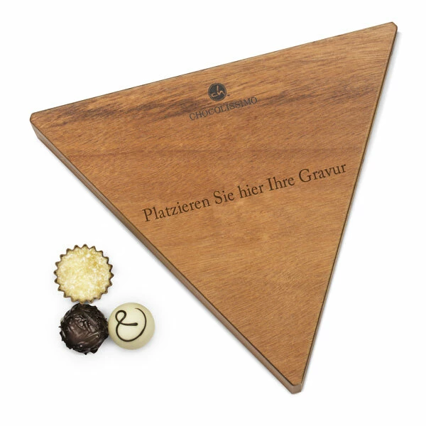 Dieses geometrisch perfekte Dreieck ist so elegant wie sein Inhalt. Wenn Sie ein außergewöhnliches Pralinenpräsent für einen besonderen Anlass suchen, ist das genau das Richtige. Dieses exklusive Holzschatzkästchen beinhaltet eine erlesene Auswahl von zwölf handgefertigten Pralinen, mit und ohne Alkohol. Das Holzschatzkästchen kann per Lasergravur mit einem von Ihnen gewählten Text versehen werden. Die Gravur wird mittig auf dem Deckel des Kästchens angebracht.