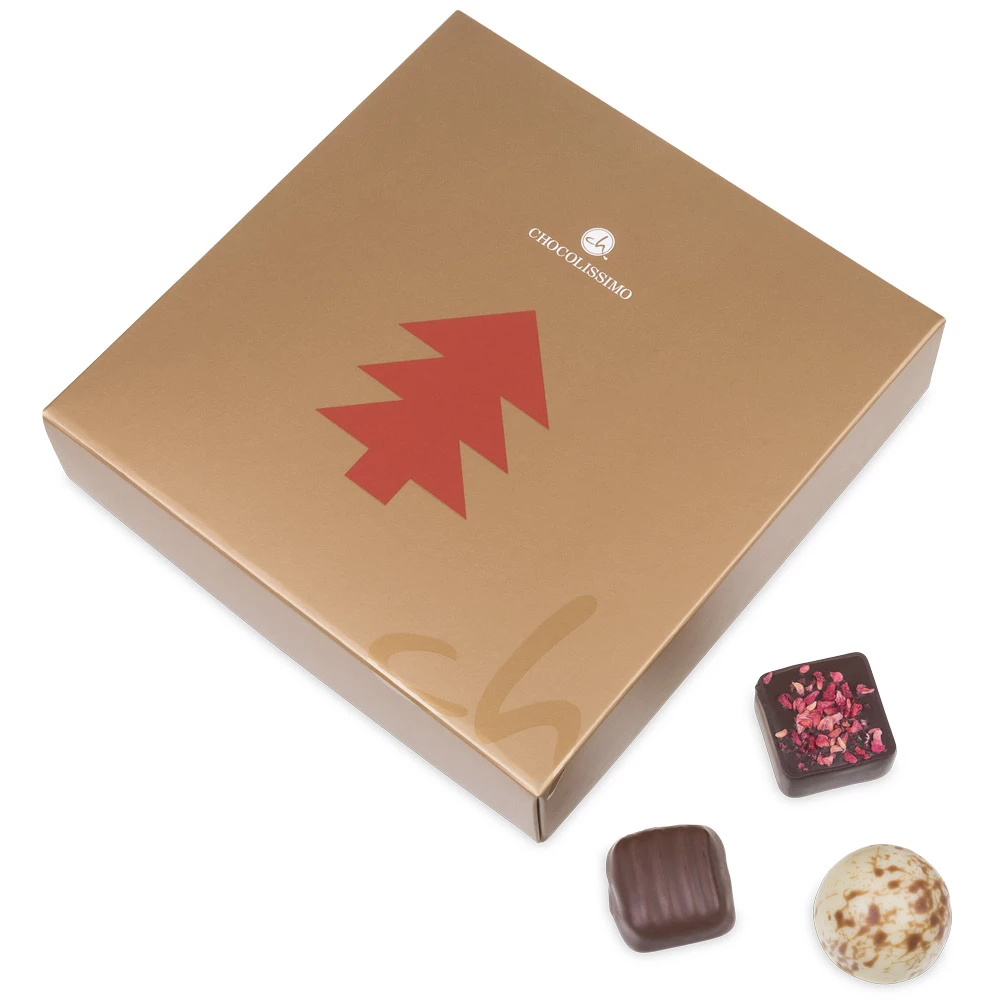 9 leckere, handgefertigte Pralinen, verpackt in einer eleganten, weihnachtlichen Verpackung. Pralinen enthalten teilweise Alkohol.