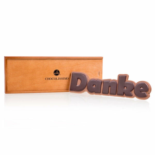 Es gibt viele Arten sich bei seinen Mitmenschen zu bedanken, doch keine ist so süß wie dieser Dankesgruß aus feinster Zartbitter- und zartschmelzender Vollmilchschokolade! Der handgegossene Schriftzug findet in einer eleganten Holzschatulle Platz, welche mit einer individuellen Lasergravur versehen werden kann. Die Gravur wird auf dem Schuber unterhalb des ‚CHOCOLISSIMO‘-Logos angebracht.