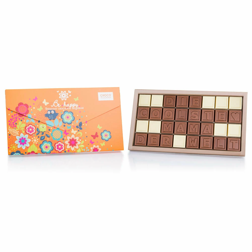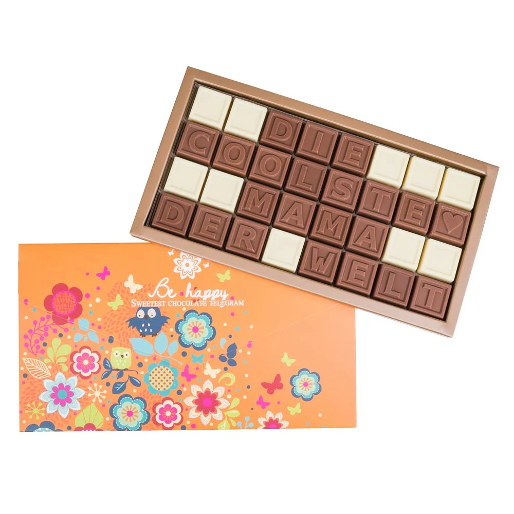 Mit dieser süßen Botschaft aus 32 Schokosteinen machen Sie Ihrer Mutter eine besonders süße Freude. Sie enthält die Nachricht ‚Die coolste Mama der Welt‘ und ist in einer Schachtel im Umschlags-Design verpackt.