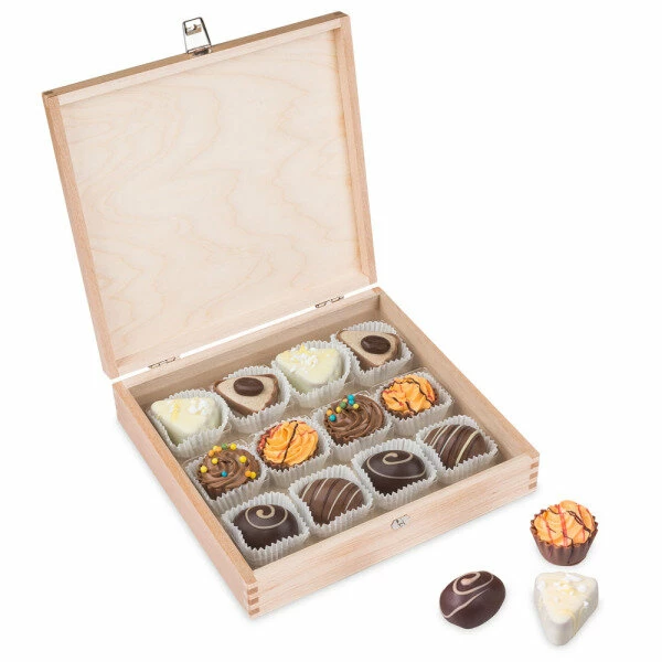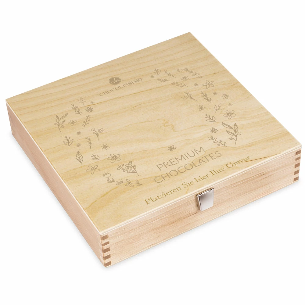 Damit die Wahl zwischen all unseren Osterprodukten leichter fällt, haben wir dieses Wunderschöne Potpourri erstellt. Die Easter Chocolates Collection kombinieren drei verschiedene Produkte in einem Set. Das neue „drei in eins“ bringt eine Vielfalt an Füllungen, die mit feinster Schokolade umhüllt wurde. Lass dich von den außergewöhnlichen Geschmackssorten überraschen. Du kannst bei dieser eleganten Holzschachtel auch eine individuelle Gravierung einfügen lassen, um es als Geschenk persönlich zu machen.