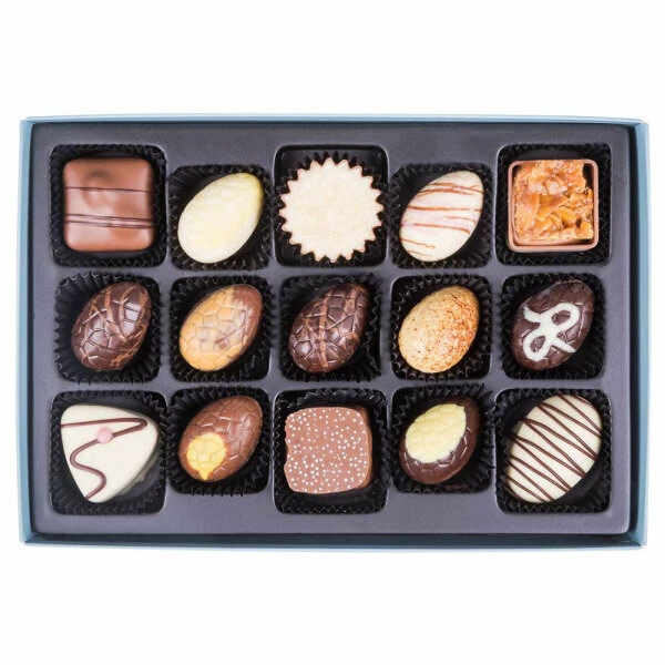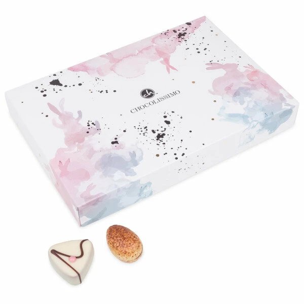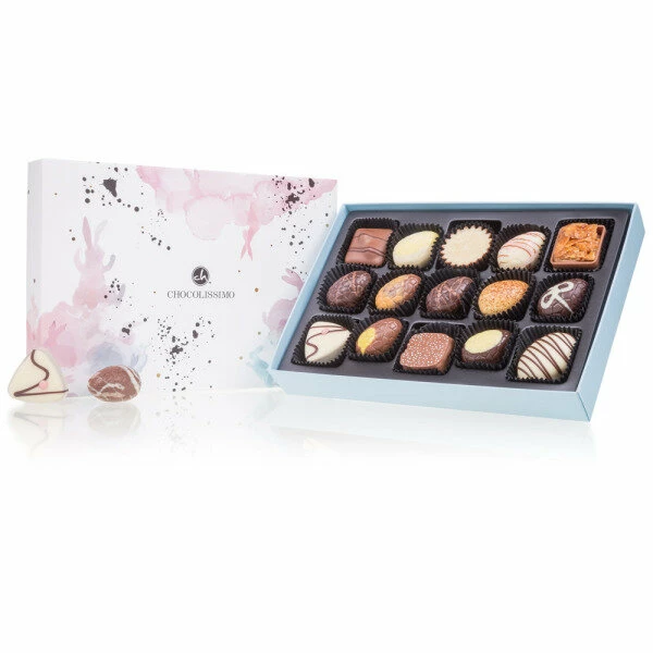 Eine Schachtel mit vorzüglichem Inhalt: 15 deliziöse Schoko-Ostereier und Pralinen, die durch ihre hübschen Verzierungen und ihre köstlichen Füllungen bestechen!
