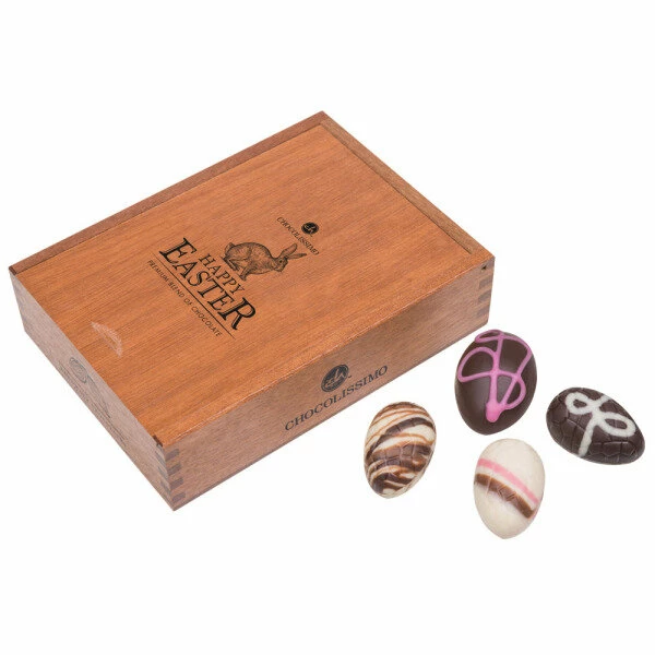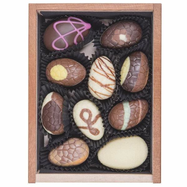 Sie suchen ein kleines Oster-Präsent? Dieses exklusive Holzschatzkästchen beinhaltet eine erlesene Auswahl von zehn gefüllten Schoko-Ostereiern ohne Alkohol.