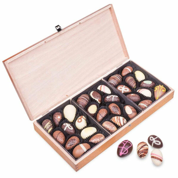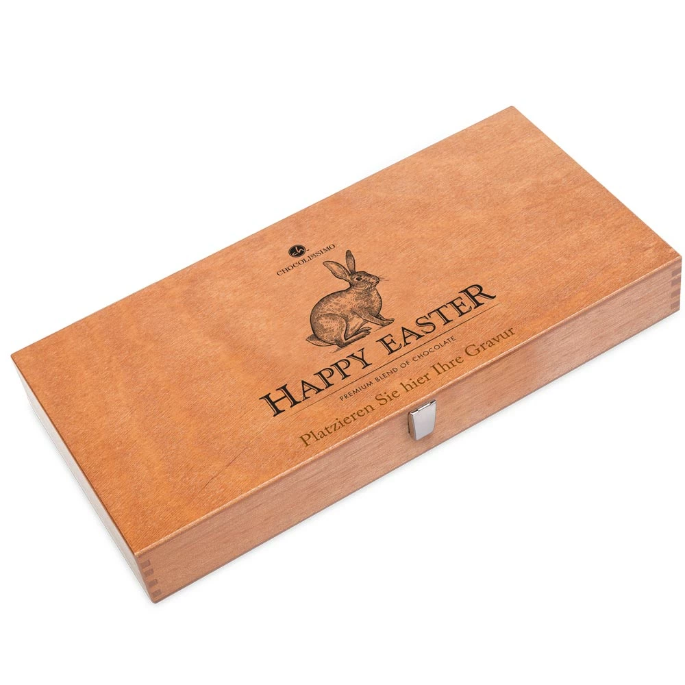 Jede Menge Ostereier-Genuss in einem eleganten Holzkästchen! Ein hervorragendes Ostergeschenk! Dieses elegante Holzschatzkästchen beinhaltet eine erlesene Auswahl von dreißig gefüllten Schoko-Ostereiern ohne Alkohol. Aber damit nicht genug: Das elegante Holzkästchen kann mit einer persönlichen Gravur versehen werden! Die Gravur wird mittig auf dem Deckel unterhalb des Ostermotivs angebracht und macht dieses Oster-Geschenk zu etwas ganz Besonderem! Ohne Alkohol.