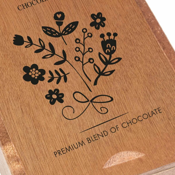 Die Holzschatzkästchen können per Lasergravur mit einem von Ihnen gewählten Text (max. 25 Zeichen) versehen werden. Die Gravur wird frontal anstatt der Abbildung der Kakaobohnen angebracht. Sollten Sie keine Gravur wählen, so wird auf dem Kästchen standardmäßig eine Abbildung von Kakaobohnen eingraviert.