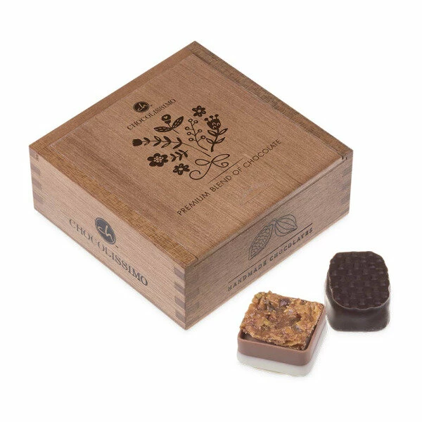 Exzellente Pralinen-Auswahl im Holzschatzkästchen – Mit Lasergravur personalisierbar!