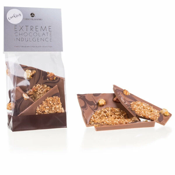Diese feinen Vollmilchschokoladenstückchen sind mit drei Bestandteilen verfeinert: Zartbitterschokolade, die mit Haselnusscreme kombiniert wurde, karamellisierte Haselnüsse und Cranberry-Kekse. Einfach knabbern und genießen!