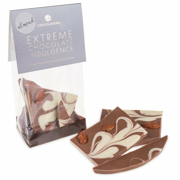 Stücke aus Vollmilchschokolade und weißer Schokolade machen in der Kombination mit Mandeln den Schokoladengenuss zu etwas Besonderem. Lassen Sie sich die Schokolade auf der Zunge zergehen und knacken Sie die leckeren Mandeln!