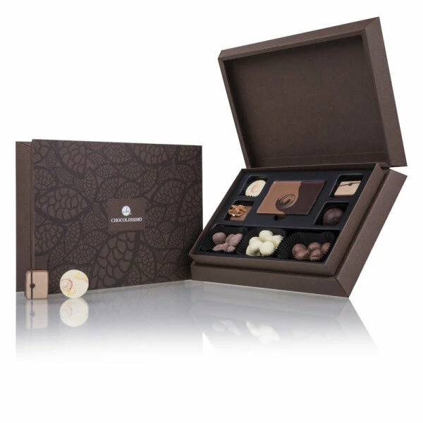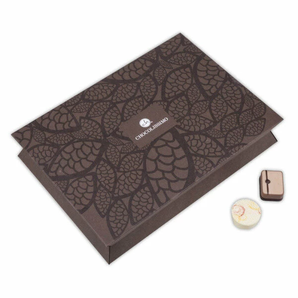 Die ‚First Selection Midi‘ bietet wirklich etwas für jeden! Sobald man die Verpackung, die mit einem wunderschönen Muster versehen ist, öffnet, erwartet einen eine tolle Auswahl aus der Produktwelt von CHOCOLISSIMO. So enthält die ‚First Selection Midi‘ eine vorzügliche Schokoladentafel aus Zartbitter- und Vollmilchschokolade, knackige Snacks, Rosinen in weißer Schokolade und eine exzellente Auswahl von vier handgefertigten Pralinen.