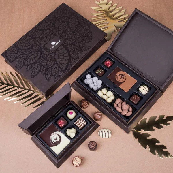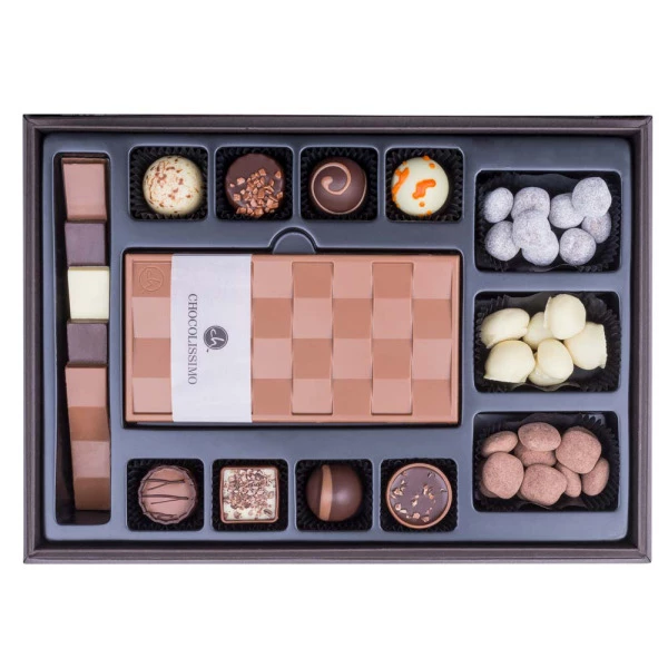 - Set aus einer großen und 5 kleinen Schokoladentäfelchen, 3 verschiedene Snacks in Schokolade und 8 Pralinen