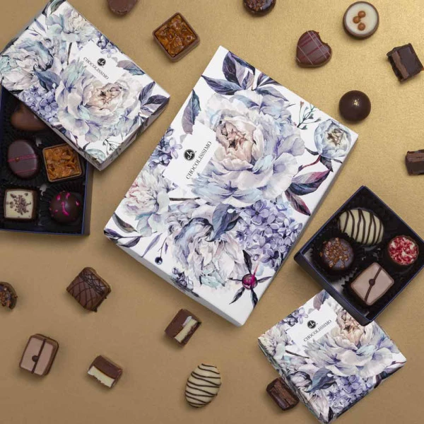 Vier Pralinen, mit Alkohol, in einer eleganten Schachtel mit Blumenmotiv. Sehr lecker und geschmackvoll präsentierte Flower Delights 4 Pralinen ergeben das perfekte Geschenk für einen geliebten Menschen oder einfach zum selber naschen.