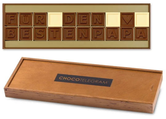 Ein schokoladiges Geschenk für den besten Papa nicht nur für Vatertag. Es gibt so viele Gelegenheiten um Danke zu sagen. Das Holzkästchen beinhaltet 20 Zeichen (2 Zeilen mit jeweils 10 Zeichen).