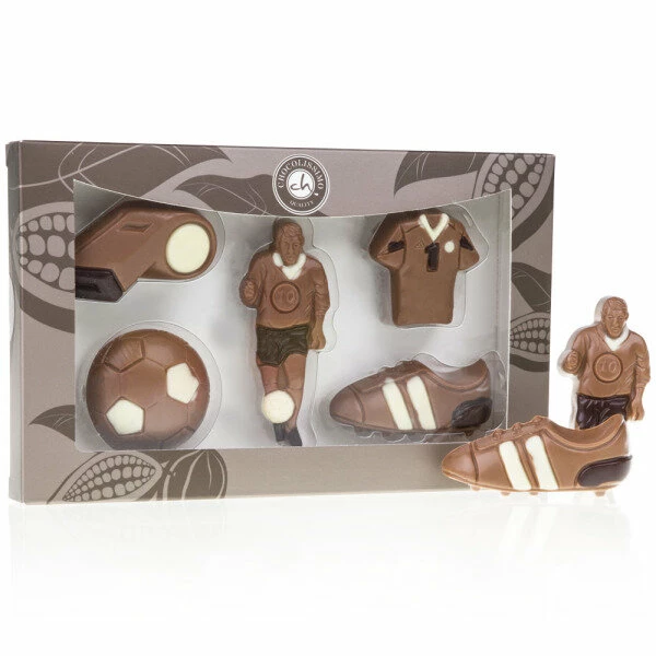 Mit diesem Set sind Sie perfekt ausgestattet für jedes Fußball-Event! Für diejenigen, die während des Fußball-Schauens was zum Naschen brauchen oder auch als Geschenk für Fußball-Fans! Die fünf Figuren rund um das Thema Fußball bestehend aus Vollmilchschokolade. Einzelne Details auf den Figuren werden aber durch Zartbitter- und weiße Schokolade hervorgehoben! Ein süßes Geschenk für große und kleine Männer!