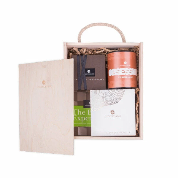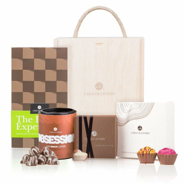 Schenke einem besonderen Menschen etwas Luxus. Dieses beeindruckende Geschenkset mit Pralinen, schokolierten Nüssen und Schokoladentafel in einem Holzkästchen ist eine herrliche Geschenkidee für jeden Schokoladen-Connaisseur. Das Set enthält: