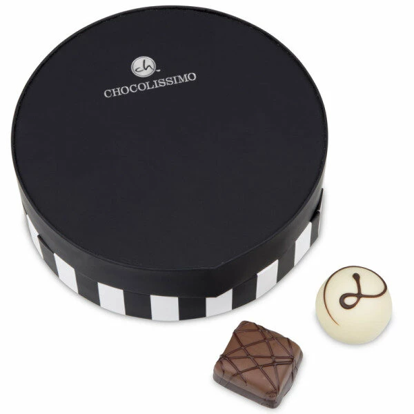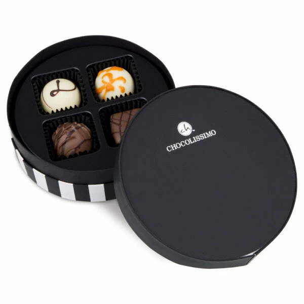 Verlockender Genuss: 4 handgefertigte Pralinen in edler Schwarz-Weiß-Schachtel