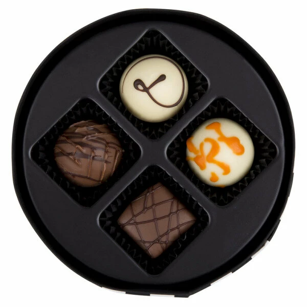 Die ‚Glamour XS‚ enthält vier leckere, handgefertigte Pralinen mit unterschiedlichen Füllungen von Chocolatiers, die Meister Ihres Fachs sind!