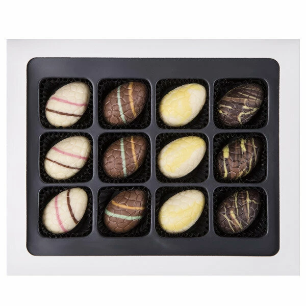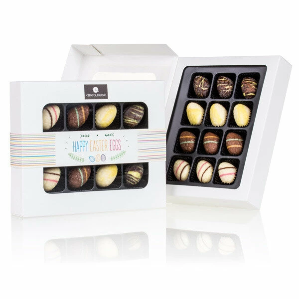Zwölf hübsch dekorierte Schokoeier zum Verschenken und selbst Vernaschen! Unsere ‚Happy Easter 12 Eggs‘ sind die perfekte Nascherei zur Osterzeit, denn sie bestehen aus feinster Vollmilch-, Zartbitter- und weißer Schokolade und enthalten köstliche Füllungen! Doch nicht nur das Innere begeistert, sondern auch das Äußere der Schoko-Ostereier durch seine entzückenden Verzierungen! Die Verpackung ist eine österliche Schachtel mit Sichtfenster.