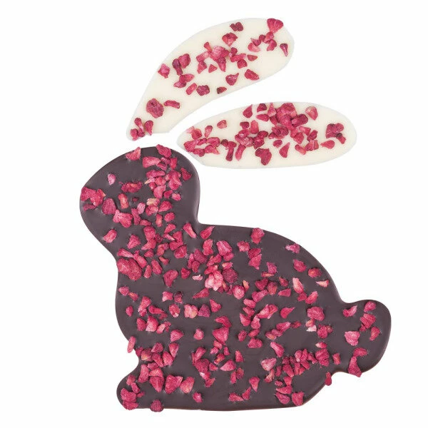 Nur die besten Schokoladentafeln zur Osterzeit: Ein leckerer Osterhase, der zur Hälfte aus weißer und zur Hälfte aus Zartbitterschokolade besteht! Bestreut ist die österliche Leckerei mit getrockneten Himbeeren. Eine tolle Komposition!