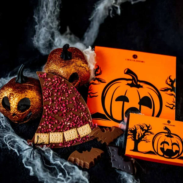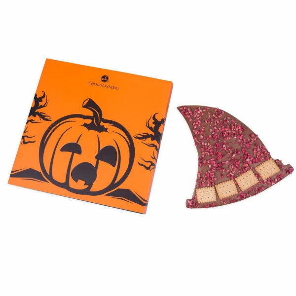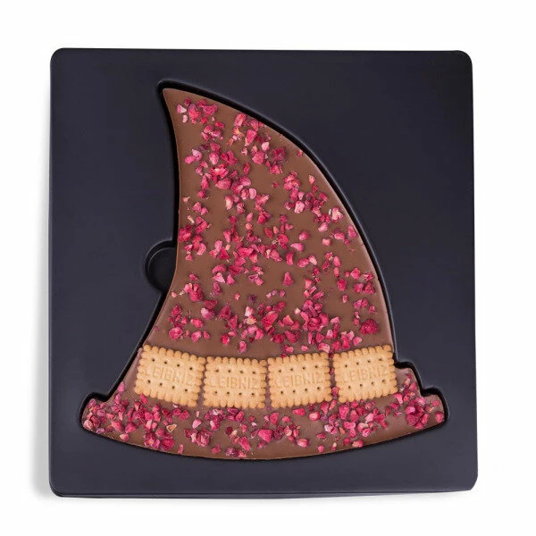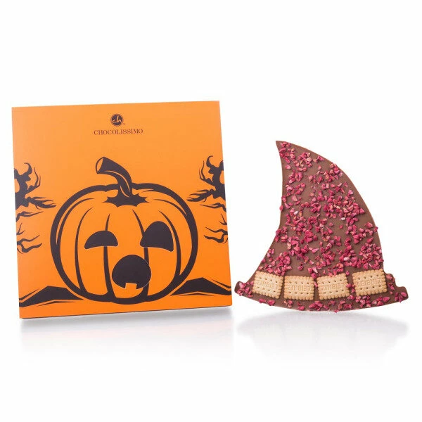 Ein Hexenhut aus Schokolade mit sorgfältig ausgewählten Zutaten ist die perfekte Wahl für Halloween. Die leckere Vollmilchschokoladentafel wird durch Kekse und Himbeeren abgerundet.