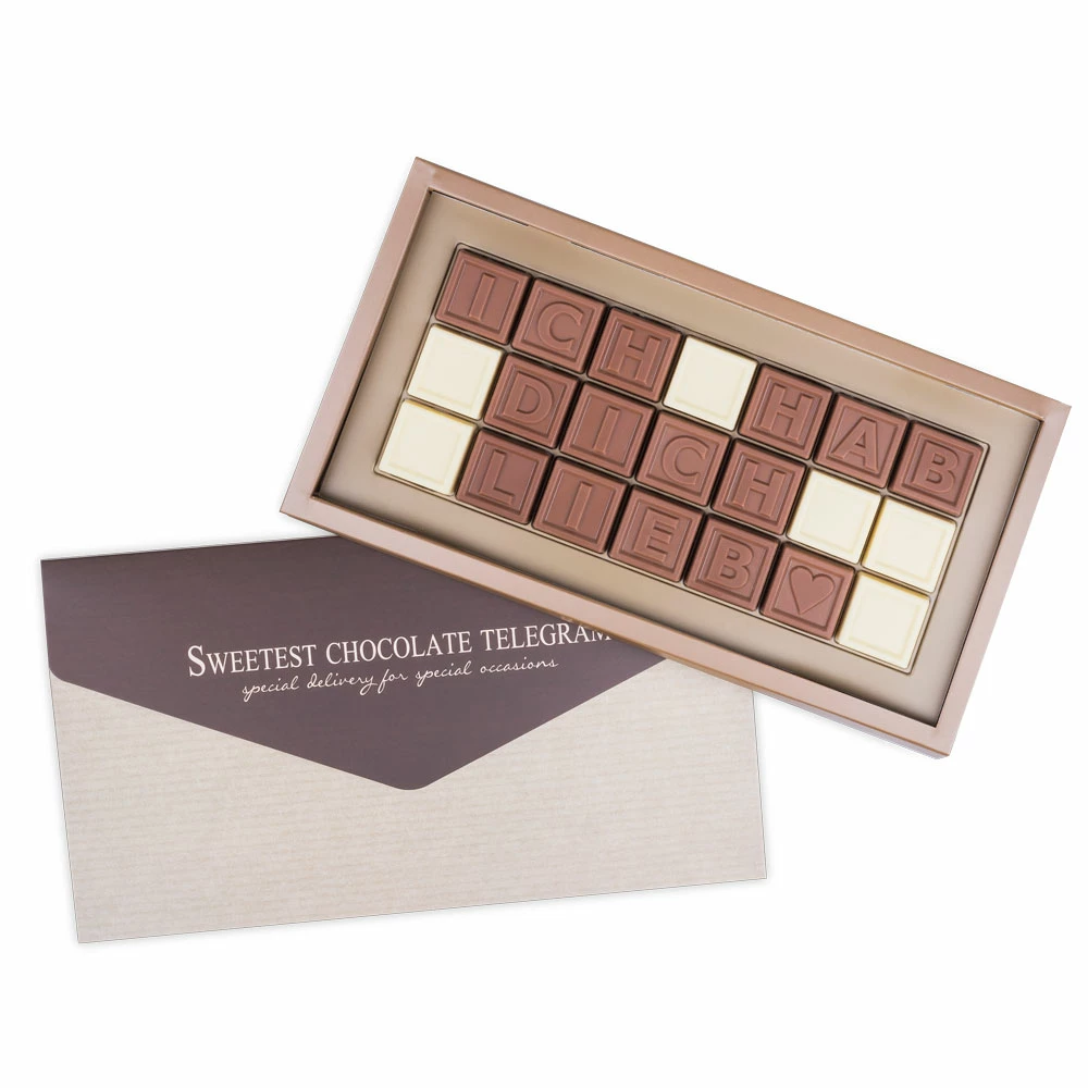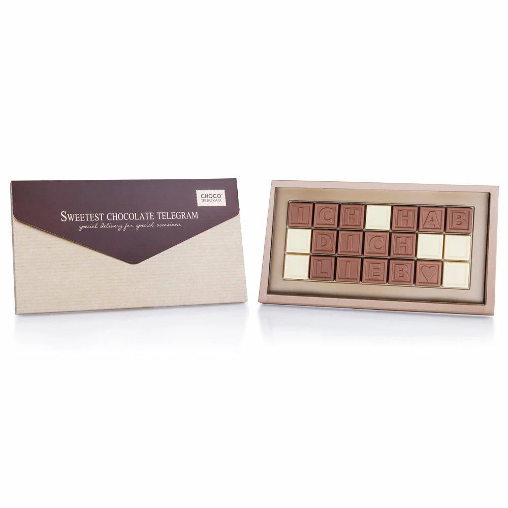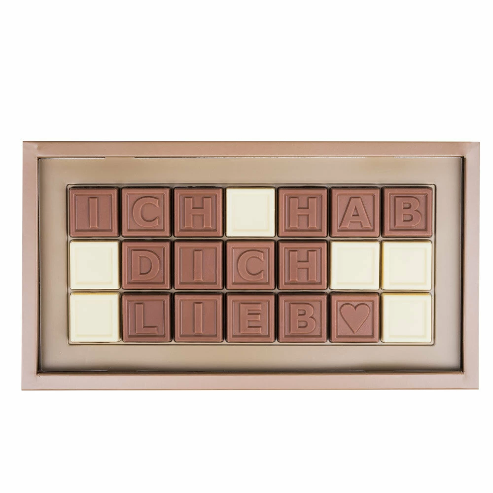 Die Schokoladennachricht „Ich hab dich lieb“ besteht aus 21 Schokosteinen aus bester belgischer Schokolade. Überraschen Sie Ihren Liebling zum Valentinstag oder auch Ihre Mama zum Muttertag mit dieser süßen Schokobotschaft.