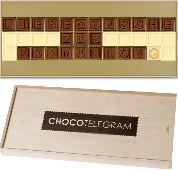 Suchen Sie ein originelles Geschenk zur Erstkommunion? Statt einer traditionellen Grußkarte verschenken Sie doch ein ChocoTelegram mit dem Text „Liebe Wünsche zur Kommunion„. Die Schokoladenbotschaft beinhaltet Steine aus Vollmilch- und weißer Schokolade, die Buchstaben und ein Symbol IHS beinhalten und zusammen eine tolle Nachricht bilden. Das Ganze ist in einem eleganten Holzkästchen verpackt. Die süßen Wünsche eignen sich perfekt als kleines Geschenk zur Erstkommunion oder als Ergänzung zu einem größeren Geschenk.