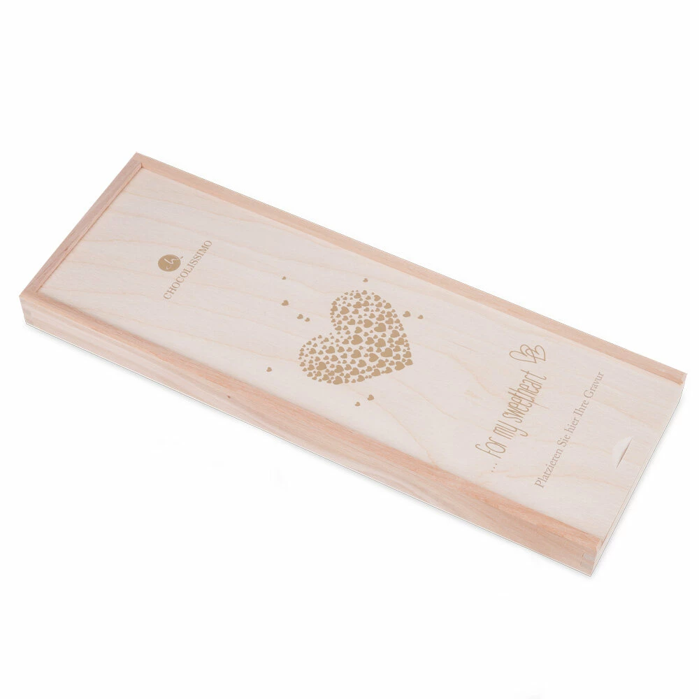 Eine persönliche Note kann man dem süßen Schokoladen-Geschenk durch eine persönliche Gravur verleihen. Einfach einen Wunschtext unterhalb eintragen – wir gravieren diesen unter den bereits vorhandenen Spruch „…for my Sweetheart“