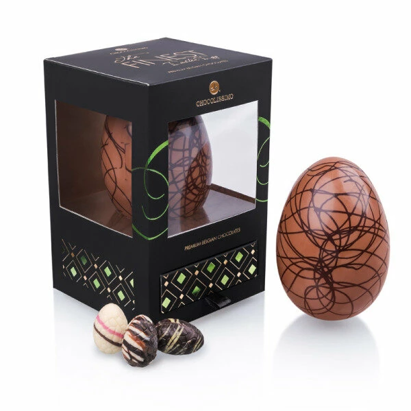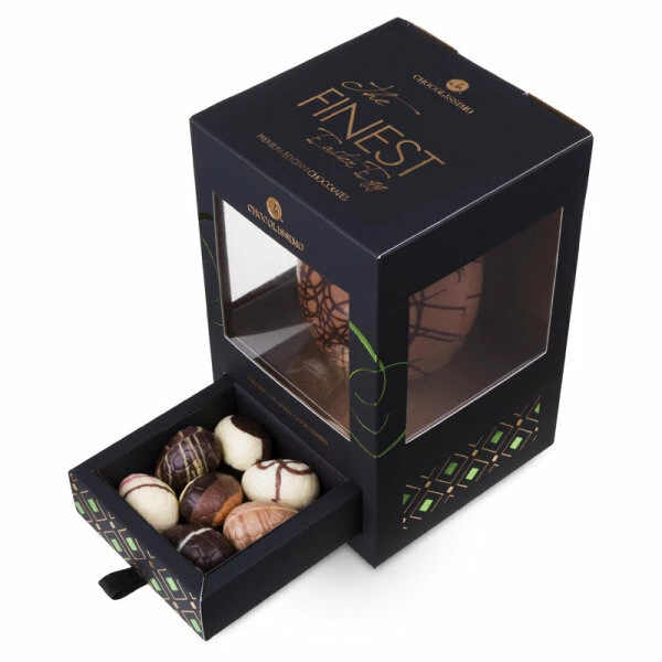In dieser eleganten schwarzen Schachtel mit grünen Highlights steckt mehr als nur ein Osterei! Zu einem großen Vollmilchschokoladen-Ei mit Verzierungen aus Zartbitterschokolade gesellen sich sieben delikat gefüllte Mini-Schokoladen-Eier, die keinen Alkohol enthalten. Die handgefertigten Ostereier-Pralinen verbergen sich in einem kleinen Schubfach und sorgen als süßes Ostergeschenk für eine gelungene Überraschung!