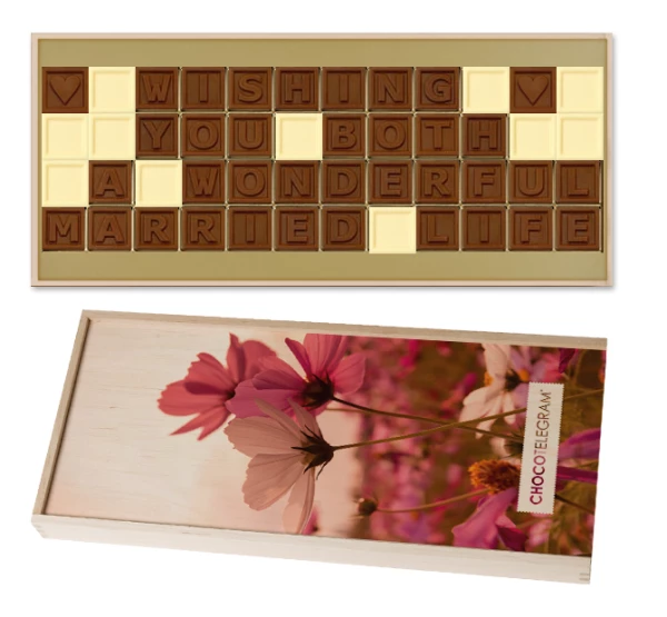 Dieses ChocoTelgram wünscht dem Hochzeitspaar auf ganz besonders süße Weise eine wundervolle Zukunft. Zusammengesetzt aus 48 Schokobuchstaben aus weißer und Vollmilchschokolade bietet es eine besondere Alternative zur Grußkarte!