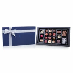 Sie suchen nach einem Geschenk für einen wahren Genießer? Dann liegen Sie mit der Pralinenmischung ‚Moments Midi‘ goldrichtig. In der dunkelblauen Schachtel, die mir einer Geschenkschleife umwickelt ist, warten 18 köstliche Pralinen auf den Beschenkten. Ergänzt wird das schmackhafte Präsent durch zwei Sorten schokoladenumhüllter Nüsse.