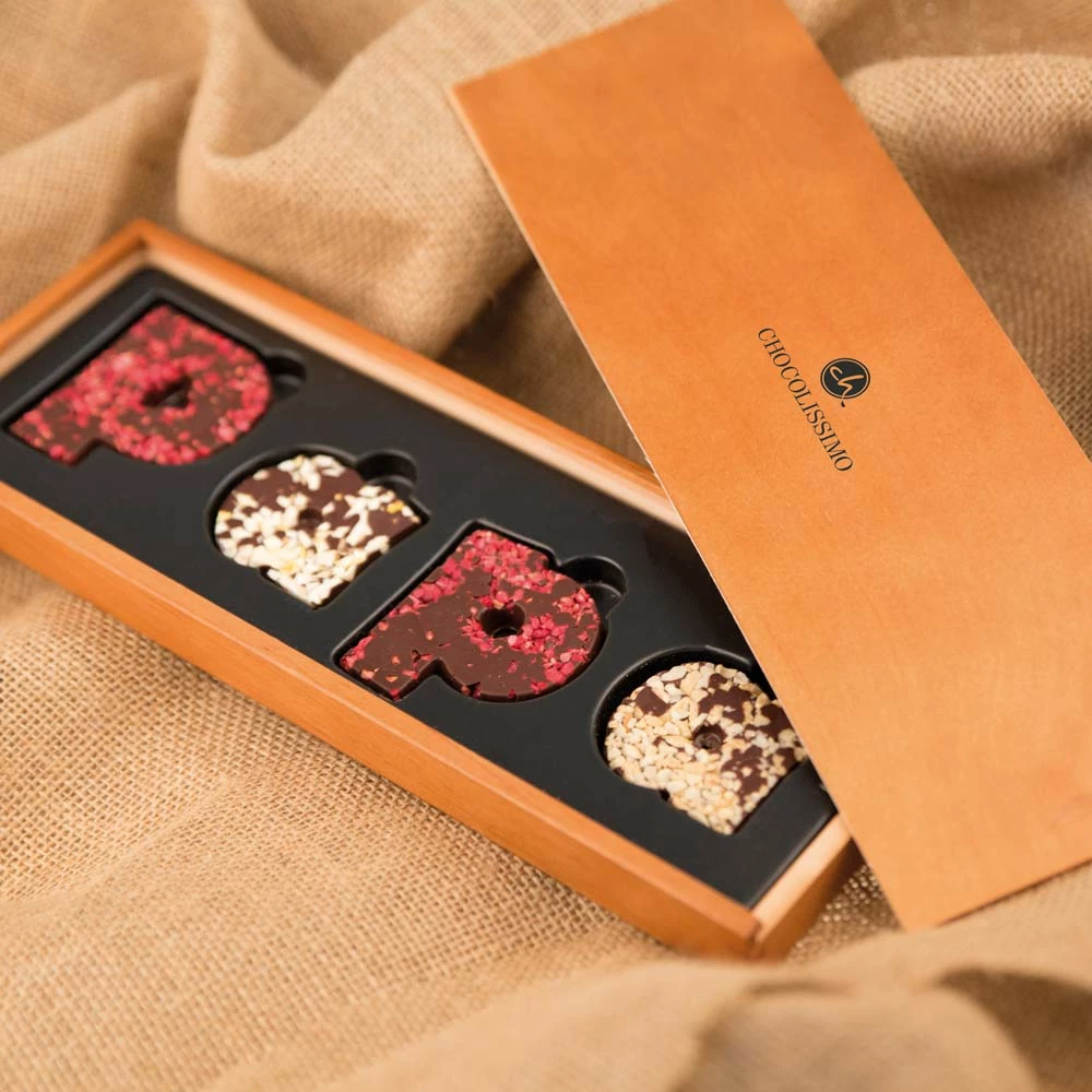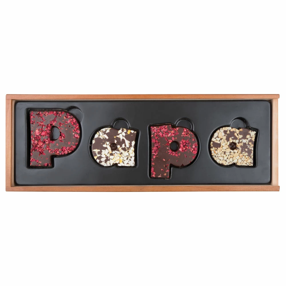 Für eine süße Überraschung zum Vatertag ist mit diesem Schokoladengeschenk gesorgt: Es besteht aus feinster Zartbitterschokolade gegossen zu dem Wort ‚PAPA‘. Fruchtig werden die Schokobuchstaben durch die getrockneten Himbeeren und Zitronenstückchen, während gehackte Mandeln für eine nussige Note sorgen.