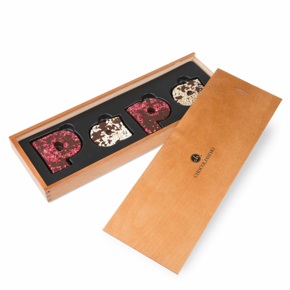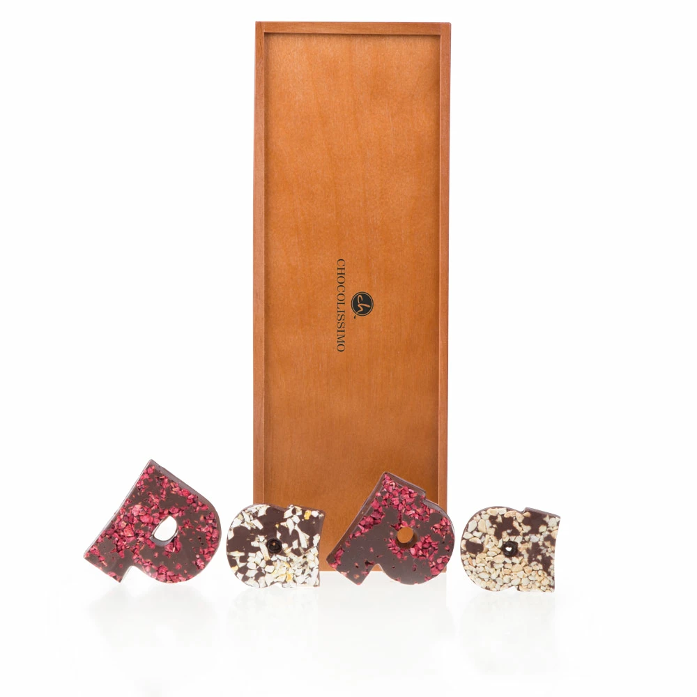 Verpackt sind die leckeren Schoko-Buchstaben in einem länglichen Holzkästchen mit unserem Logo. Darunter kann zusätzlich ein individueller Gruß eingraviert werden.