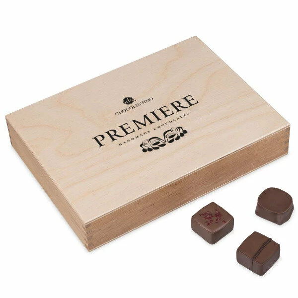 In diesem eleganten Kästchen aus hellem Holz verbergen sich 20 köstlich gefüllte Pralinen, die teilweise Alkohol enthalten. Die kleinen Leckerbissen, die mit feinster Vollmilch-, Zartbitter- oder weißer Schokolade ummantelt sind, finden in zwei separaten Fächern Platz.