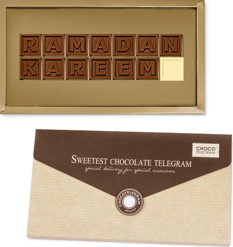 Senden Sie Ihrer Familie, oder Ihren Freunden süße Nachricht zum Ramadan Kareem und machen Sie denen eine große Freude: Diese Botschaft besteht aus 14 Schokobuchstaben, hergestellt aus feinster weißer und Vollmilchschokolade. Die Überraschung ist garantiert!