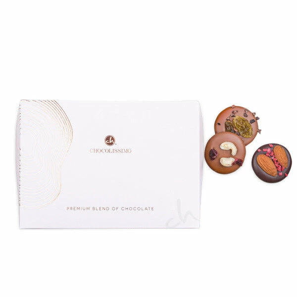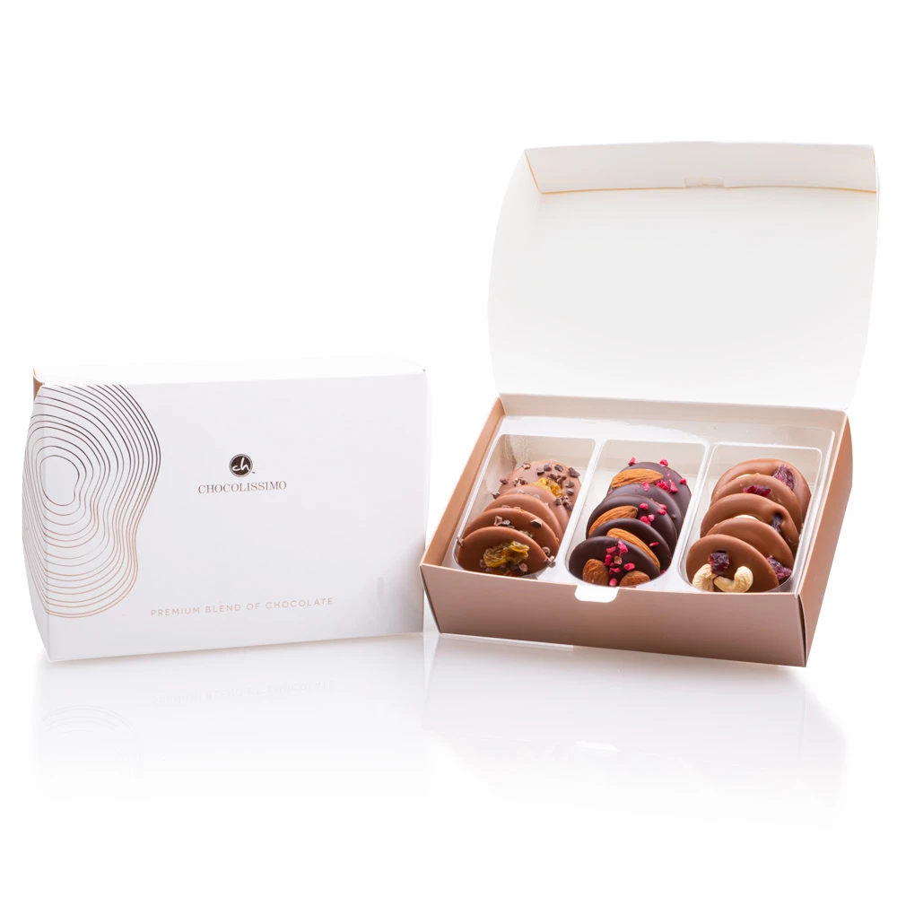 Fünfzehn unglaublich exquisite Schokotaler – das sind unsere ‚Roundies Mix‘! Fünf davon bestehen aus feinster Vollmilchschokolade und sind mit zerkleinerten Kakaobohnen und süßen Rosinen bestreut. Weitere fünf bestehen ebenfalls aus Vollmilchschokolade und sind mit Cashewnüssen und Cranberries verfeinert. Zu guter Letzt sind fünf Taler aus Zartbitterschokolade enthalten, die mit ganzen Mandeln und Himbeeren bestreut sind.