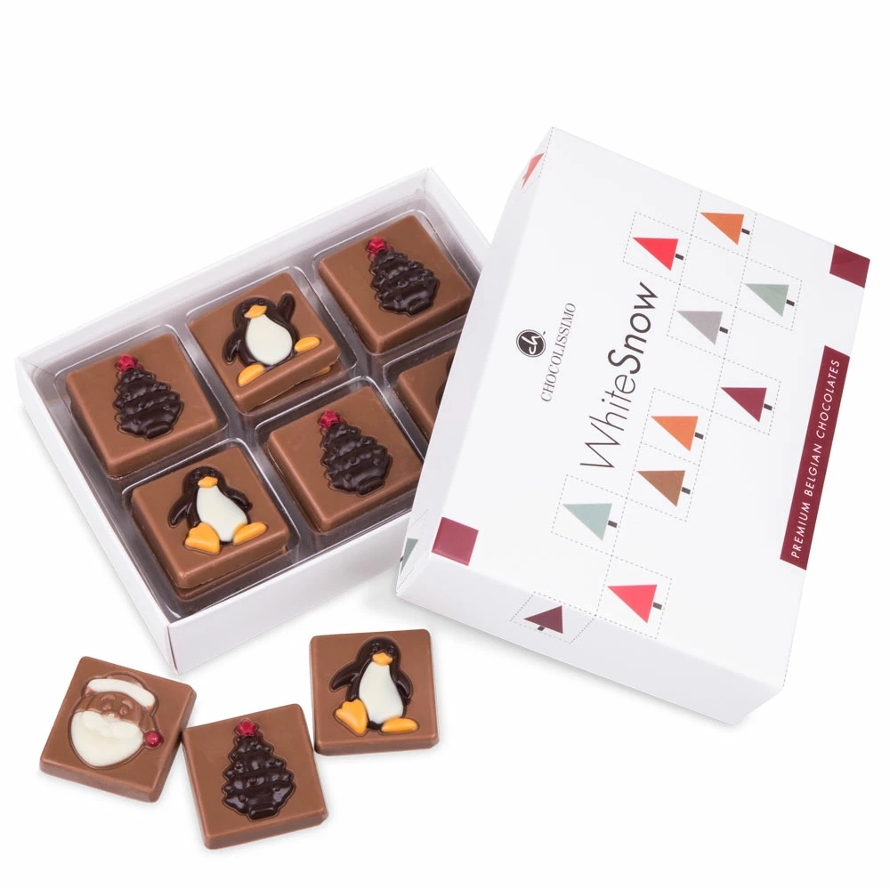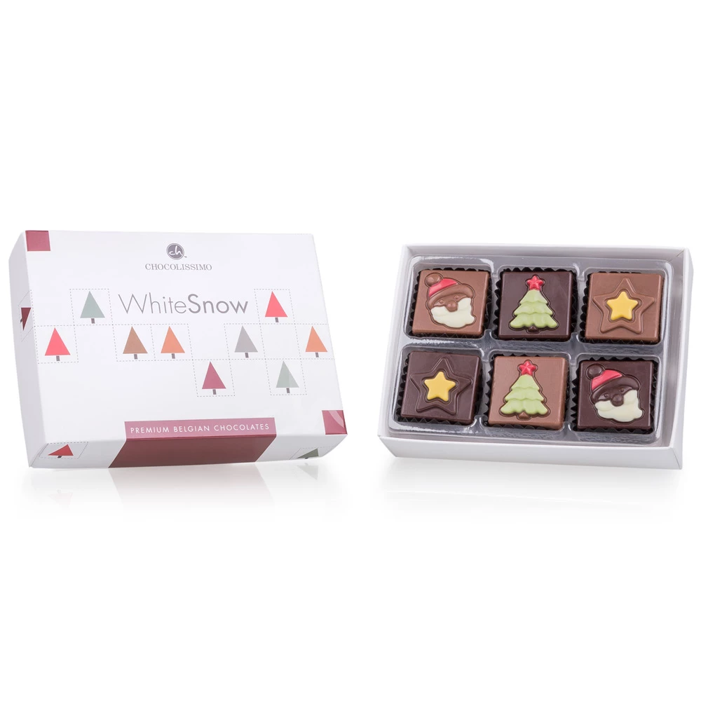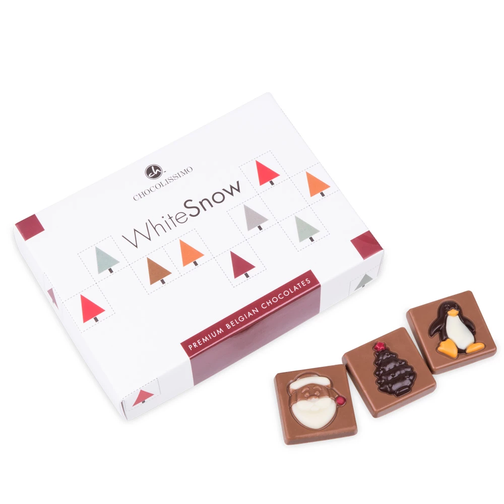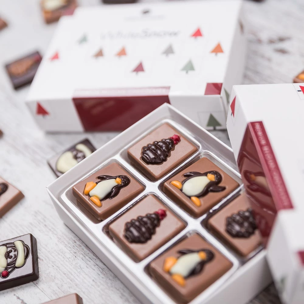 Der Inhalt dieser weihnachtlichen Schachtel verzückt große und kleine Schokoladen-Liebhaber, denn darin warten zwölf Vollmilchschokoladen-Täfelchen mit niedlichen Weihnachtsmotiven aus weißer, Zartbitter- und eingefärbter Schokolade. So kommt Weihnachtsstimmung auf!