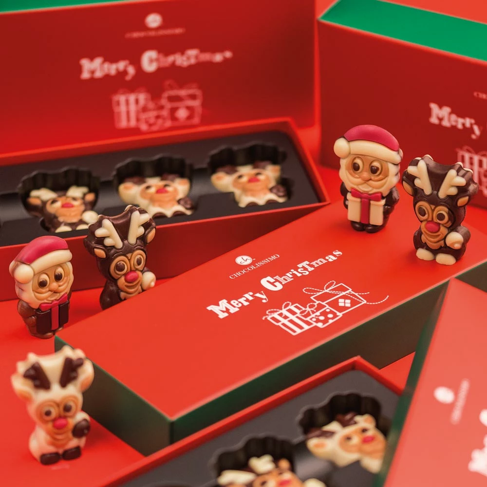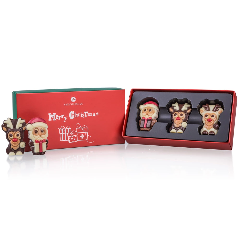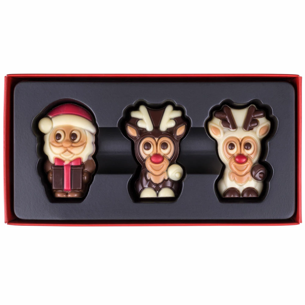 Ein bezauberndes Set bestehend aus 3 Schokoladenfiguren (Weihnachtsmann mit 2 Rentieren) aus bester belgischer Schokolade mit Haselnussfüllung. Ohne Alkohol.