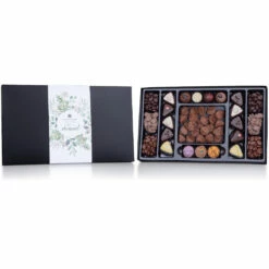 Das „Schoko Partybox I“ Set ist eine exquisite Auswahl an Schokoladenpralinen und Snacks, die in einer eleganten schwarzen Schachtel mit einem Band verpackt sind, das mit Pflanzenmotiven verziert ist. Im Inneren finden Sie verschiedene Geschmacksrichtungen von Pralinen, die im Gaumen aufblühen und unvergessliche Momente des süßen Genießens schaffen. Dies ist das perfekte Set, um besondere Momente mit Ihren Liebsten zu teilen.