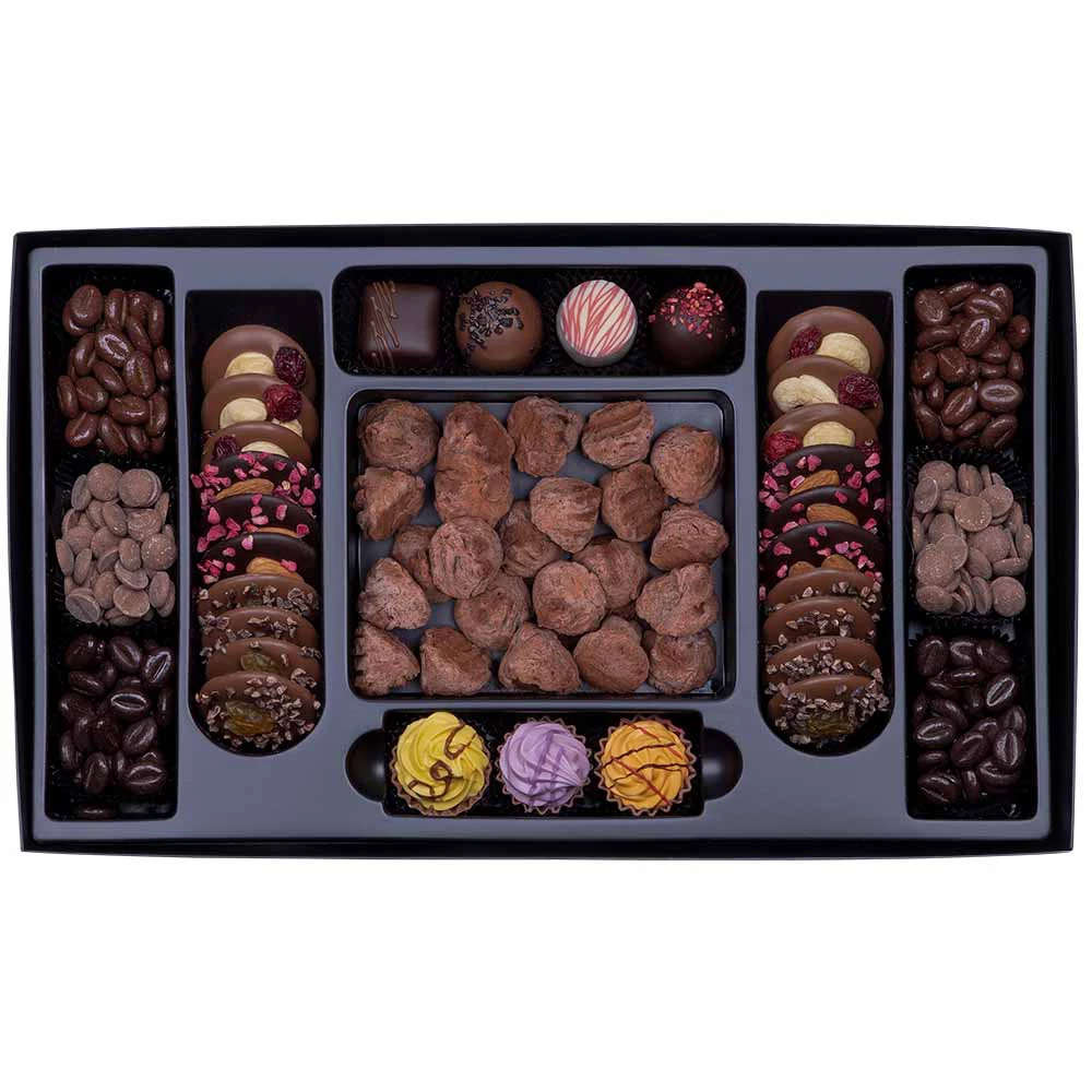 Das „Schoko-Partybox II“ Set präsentiert sich in einer stilvollen schwarzen Schachtel mit einer zarten Banderole, die mit Pflanzenmotiven verziert ist. Im Inneren verbirgt sich exquisite Schokoladenpralinen und Snacks, darunter die beste belgische Schokolade. Das Set vereint perfekt die Süße mit der Knusprigkeit von Nüssen und Trockenfrüchten. Es ist eine ausgezeichnete Wahl für Liebhaber der Geschmacksharmonie, die diesen Moment gerne mit ihren Liebsten teilen möchten.