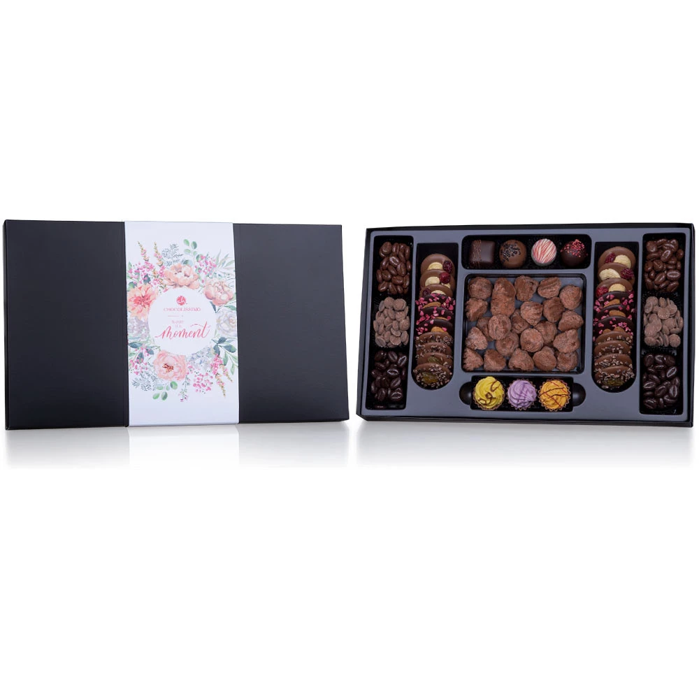 Stilvolle Präsentation: Das „Schoko-Partybox II“ Set in eleganter schwarzer Schachtel mit zarter Pflanzenmotiv-Banderole!